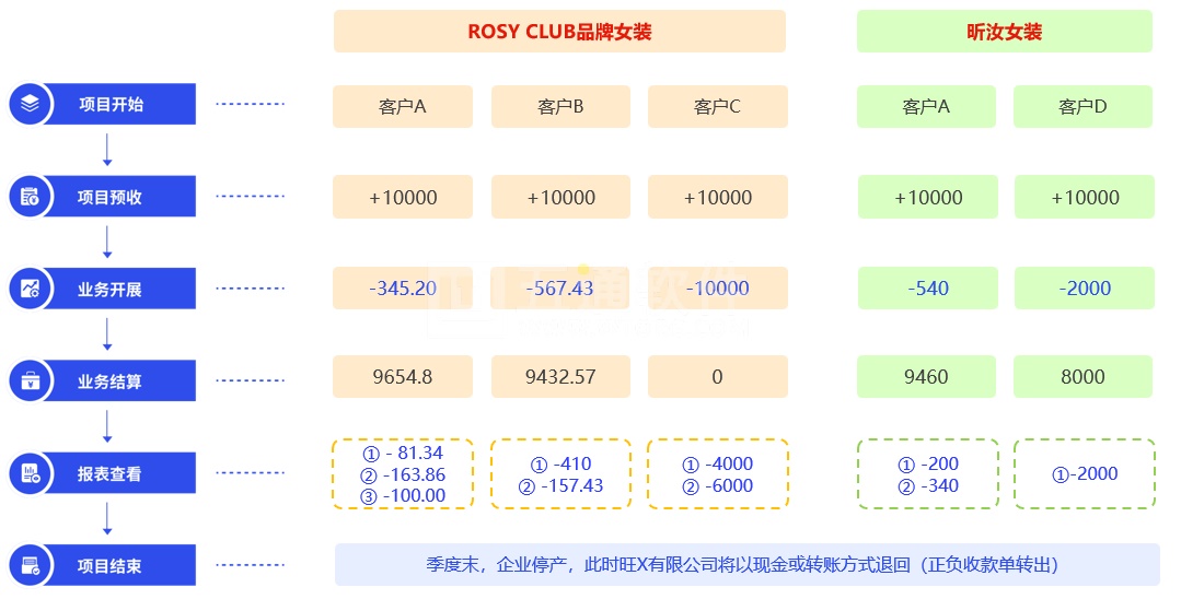 湖南旺X有限公司為貼牌生產(chǎn)(兩種不同品牌長(zhǎng)裙):要求下游經(jīng)銷(xiāo)商均要在季度末預(yù)交1w元,用于下季度拿貨;下季度末停產(chǎn)時(shí),未用完的金額將退還