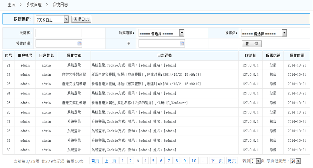 系統(tǒng)日志: 1.清理日志:清理日志 可以清除三個(gè)月以前的 一個(gè)月以前的 一周以前的 2.查詢(xún)?nèi)罩荆焊鶕?jù)條件查詢(xún)數(shù)據(jù)(關(guān)鍵詞、時(shí)間段、按店鋪、按操作員)