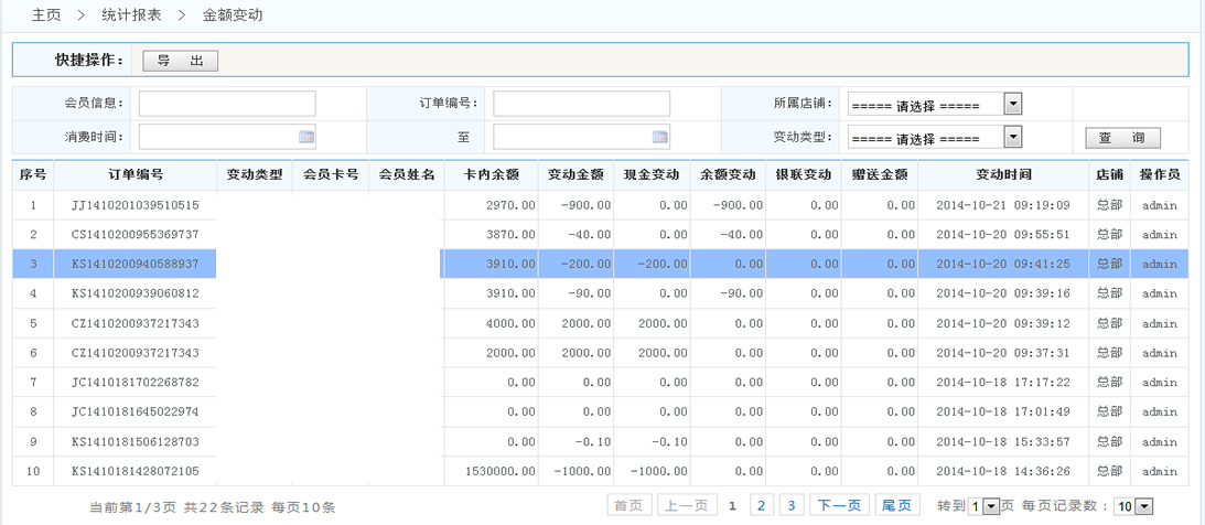 交班管理統(tǒng)計: 1.導(dǎo)出:將按條件查詢到的數(shù)據(jù) 導(dǎo)出成Excel表格 2.查詢:按照條件查詢出數(shù)據(jù)(例如 根據(jù)會員的店鋪會員的等級等)
