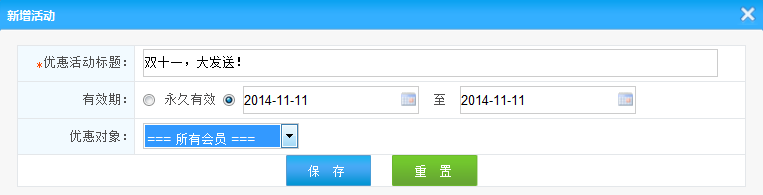 2.優(yōu)惠活動(dòng)期限:設(shè)置這次活動(dòng)的期限,可以長(zhǎng)期有效,也可以一段時(shí)間有效