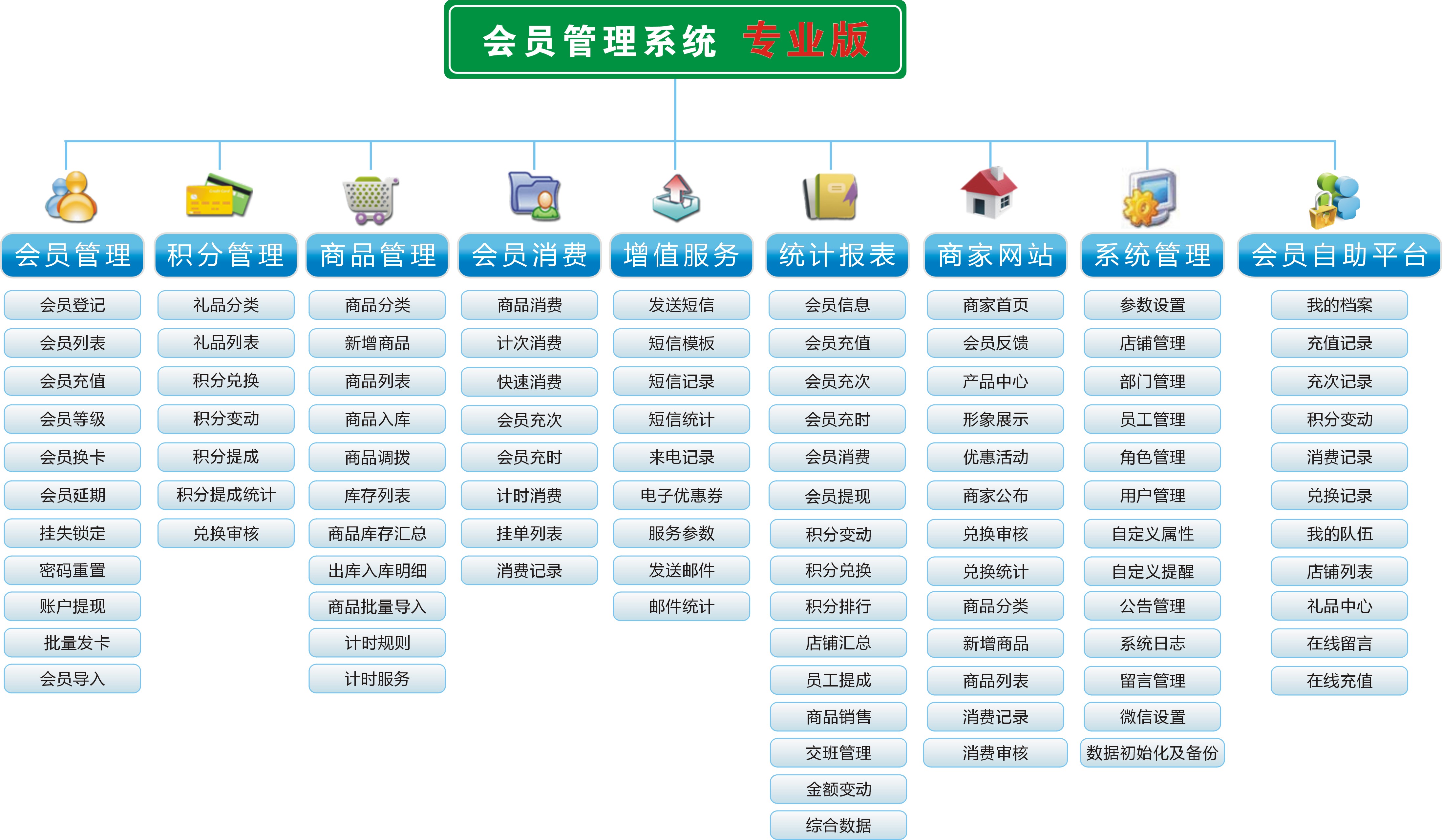 會(huì)員管理、積分管理、商品管理、會(huì)員消費(fèi)、增值服務(wù)、統(tǒng)計(jì)報(bào)表、商家網(wǎng)站、系統(tǒng)管理等大模塊 可以對(duì)分店管理及各種消費(fèi)數(shù)據(jù)分析!其適用于醫(yī)藥連鎖,美容美發(fā)連鎖店、超市連鎖店、服裝店連鎖店、母嬰店連鎖店、健身房連鎖店、